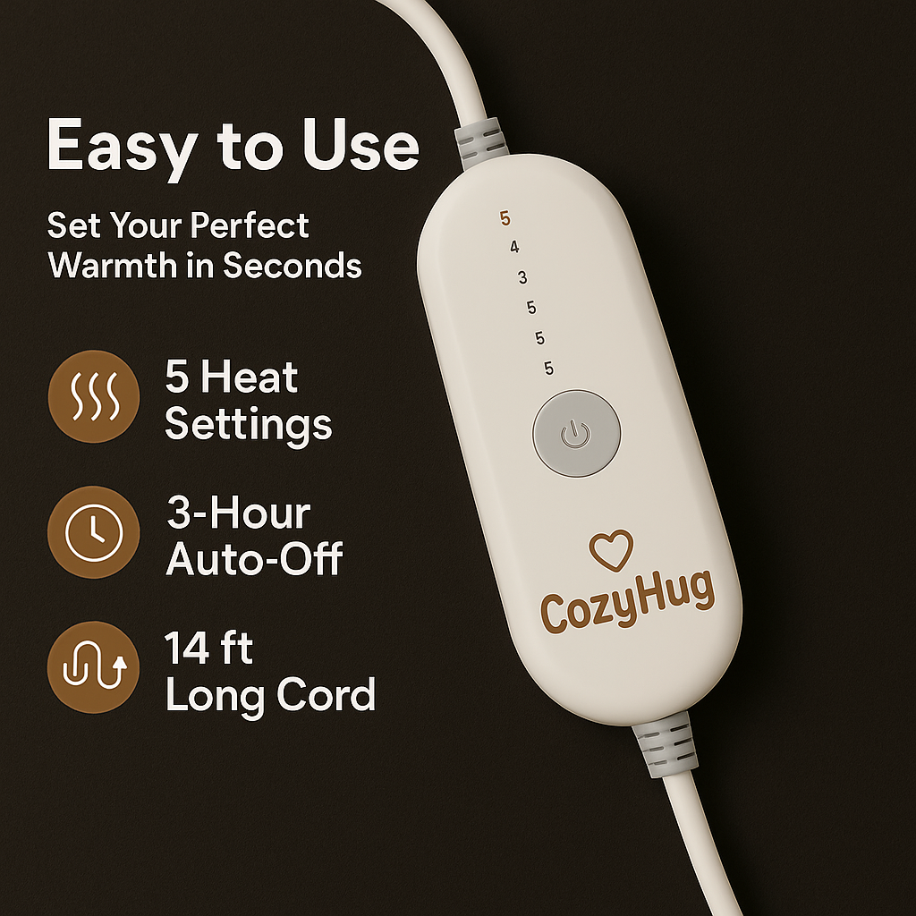 Find your perfect cozy level with just one touch. Choose from 5 gentle heat settings, enjoy the peace of mind of a 3-hour auto-off, and relax anywhere thanks to the extra-long cord. Everything about CozyHug is designed to make comfort feel easy.